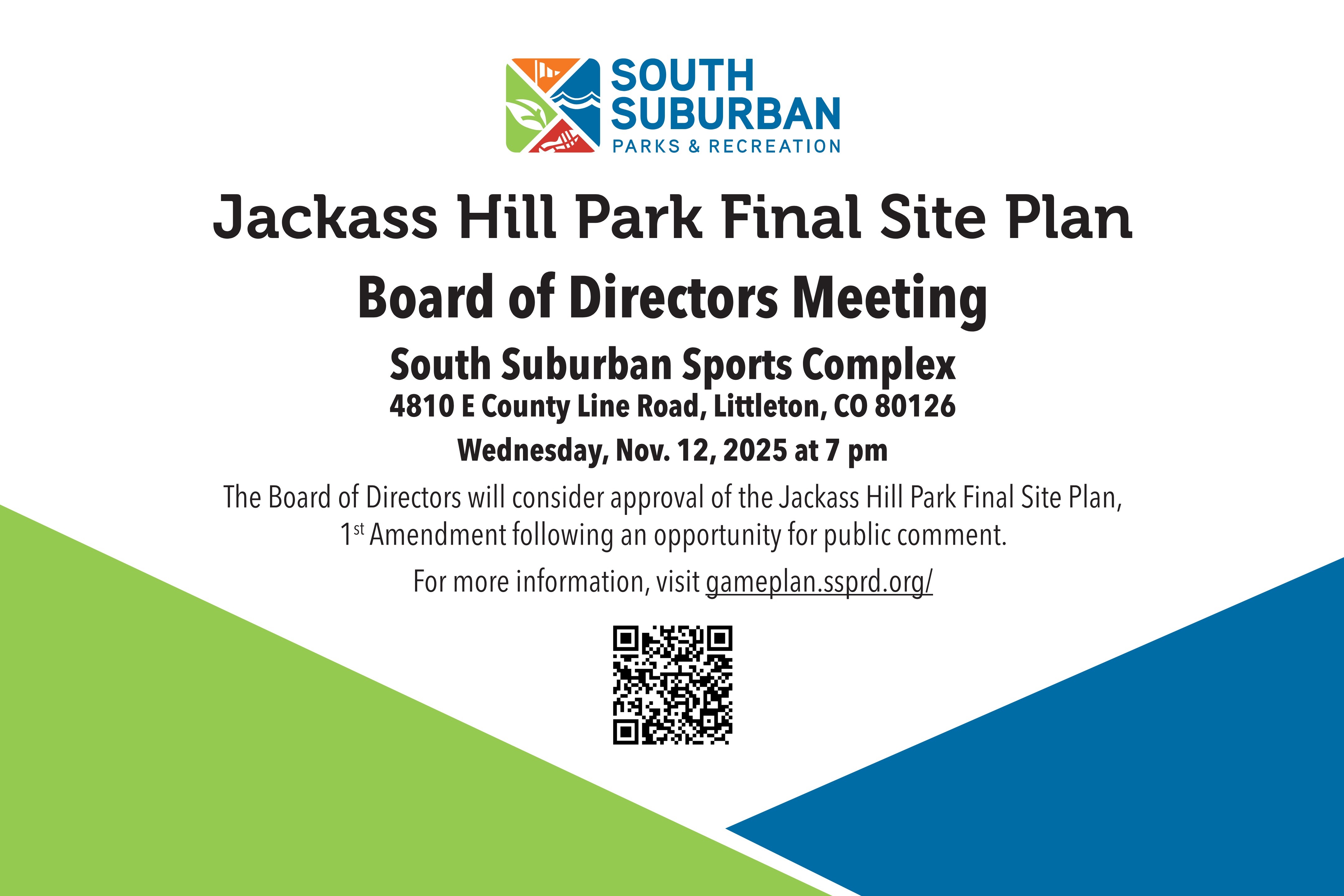Share Jackass Hill Park Final Site Plan - Board of Directors Meeting on Facebook Share Jackass Hill Park Final Site Plan - Board of Directors Meeting on Twitter Share Jackass Hill Park Final Site Plan - Board of Directors Meeting on Linkedin Email Jackass Hill Park Final Site Plan - Board of Directors Meeting linkThe South Suburban Board of Directors will consider approval of the Jackass Hill Park Final Site Plan, 1st Amendment, following an opportunity for public comment. The Site Plan will be reviewed during the Board’s business meeting on Wednesday, November 12, 2025, at 7 p.m. at the South Suburban Sports Complex, 4810 E County Line Road, Littleton, CO 80126.