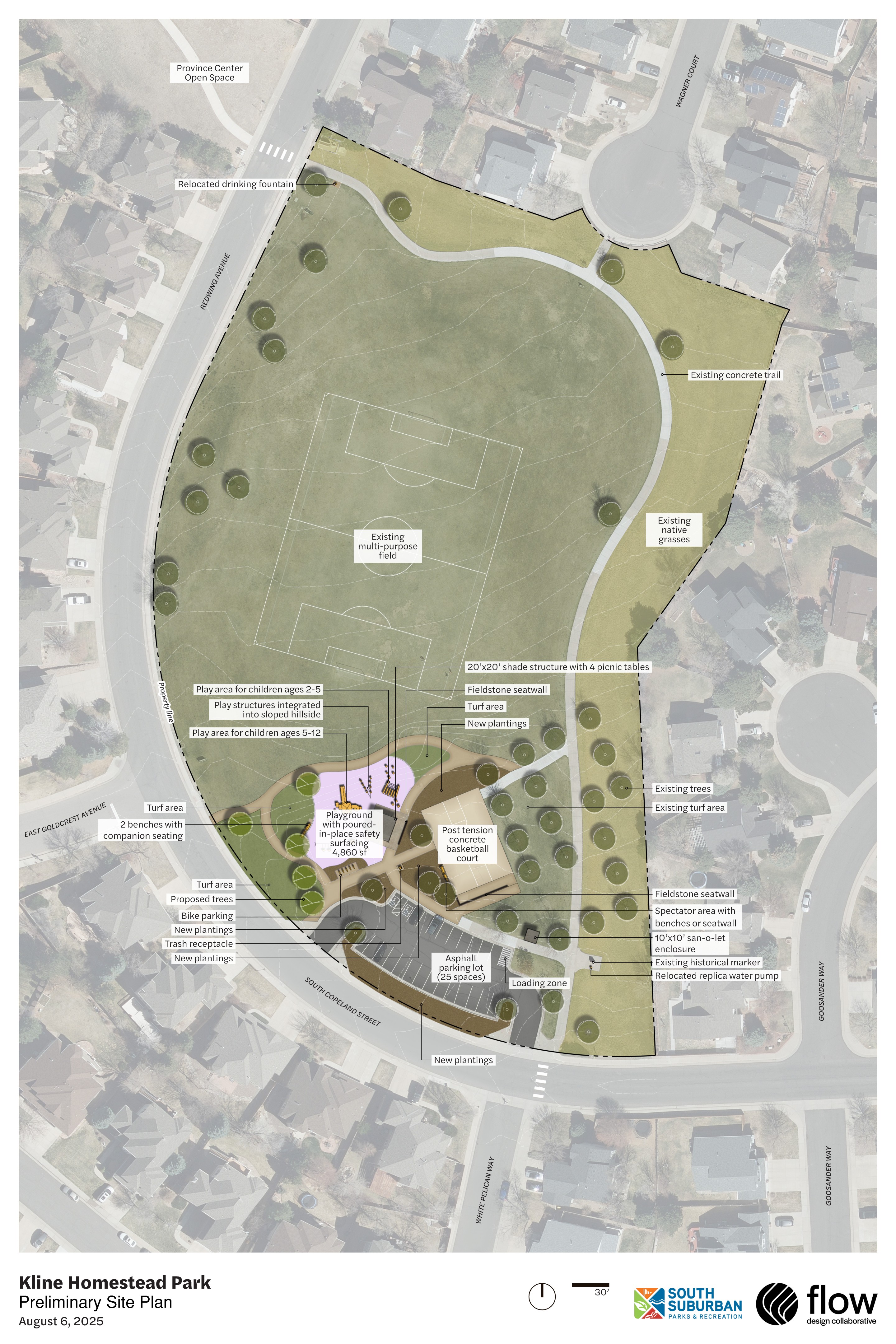 Exciting plans are underway for Kline Homestead Park! Proposed improvements include new playground equipment with poured in place rubber safety surfacing to increase ADA accessibility throughout the playground area and a post-tension basketball court for enhanced durability. A larger, lighted shade pavilion and san-o-let enclosure will improve comfort and safety for park visitors. Updated site furnishings including picnic tables, benches, and a bike rack will replace amenities at the end of their useful life. New concrete flatwork will ensure ADA accessibility around proposed amenities and the parking lot will be resurfaced.