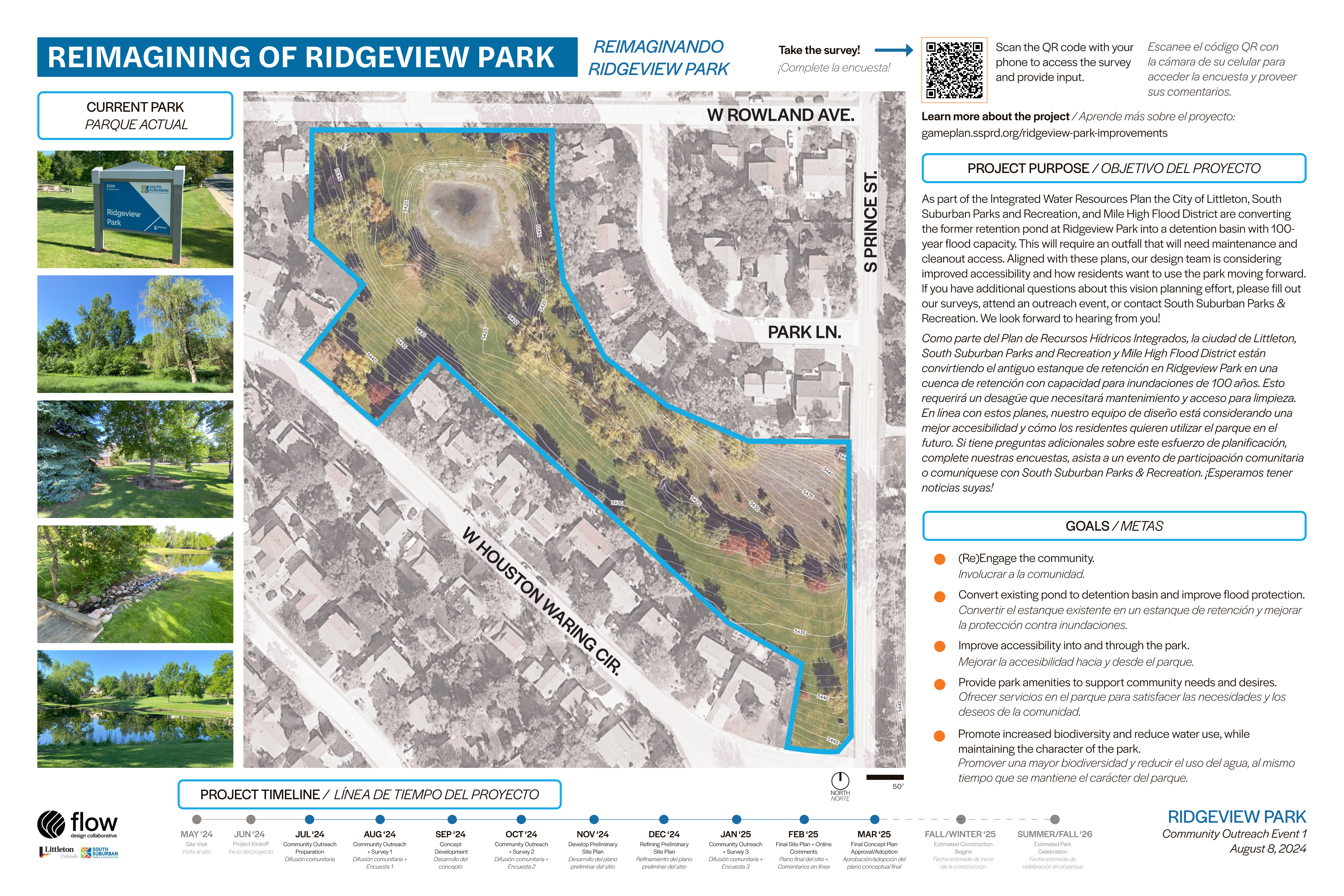 Over the past several months, the focus for the redesign of Ridgeview Park was to align two separate but related studies. The study to design future park improvements is led by South Suburban in partnership with the City of Littleton. The other redesign is an engineering study led by Mile High Flood District, in partnership with the City of Littleton, to understand the drainage needs for the future stormwater detention basin.